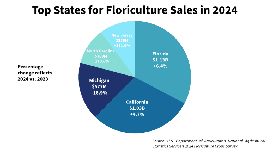 At the same time, floriculture sales remain concentrated among a handful of states. Florida and California led the nation in 2024, generating $1.13 billion and $1.03 billion in sales, respectively, followed by Michigan, North Carolina and New Jersey.